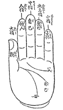 親指=親、人指(人指し指)=他人、中指=自己、無名指(薬指)=身内、小指=子孫と見ますので、この原則にのっとって、指と指の関係によって自分と家族や他人の関係を見る方法があります。